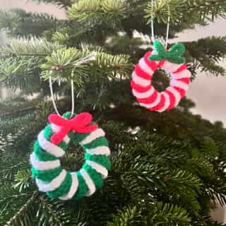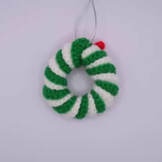 Bring classic festive colours to your tree with this spiralled crochet wreath, featuring a charming bow and silver string for hanging. It's the perfect addition to your holiday decorations.